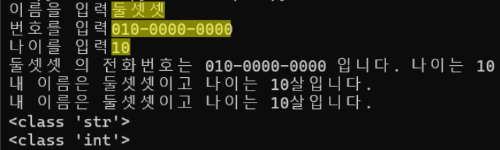 print(name, "의 전화번호는", phone, "입니다.", "나이는", age)