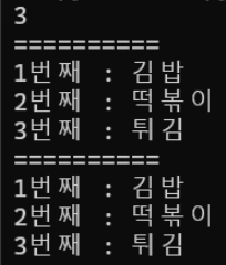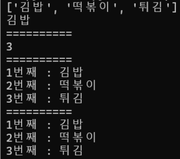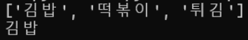 names = ['김밥', '떡볶이', '튀김']