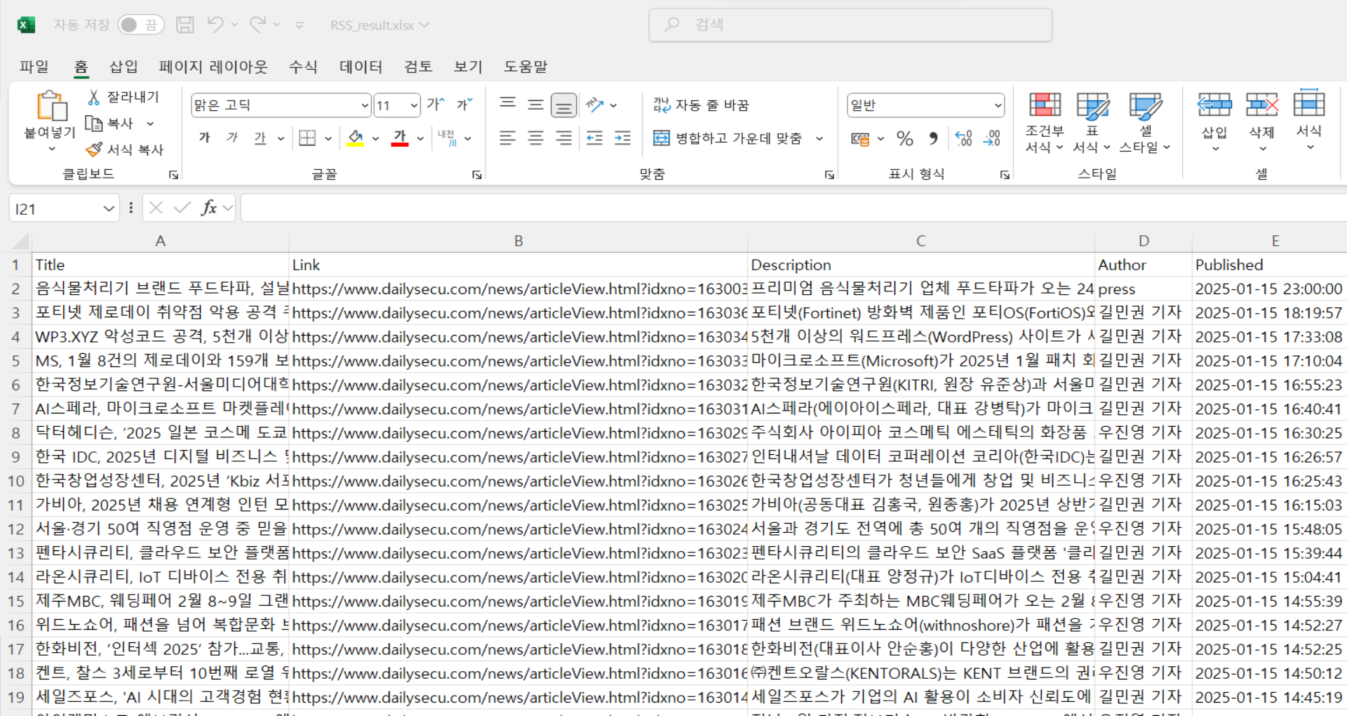 2025.01.15 - [클라우드기반 스마트 융합보안 과정] - [Python] RSS를 이용하여 데이터를 엑셀파일로 저장하기